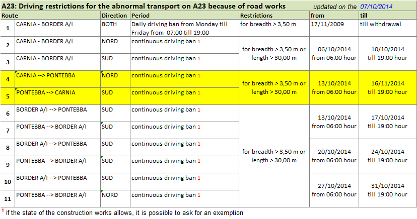 October 2014 - Motorway A23: driving restrictions for the abnormal transport